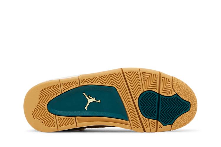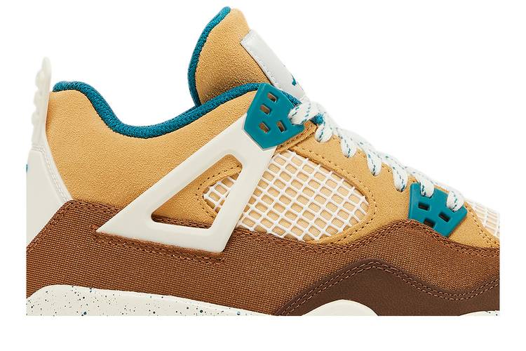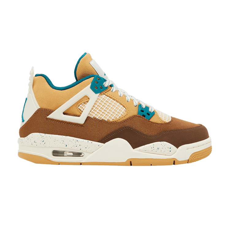 Made for big kids, the Air Jordan 4 Retro GS Cacao Wow features an upper that combines tan suede with brown textile paneling and a leather forefoot overlay in a chocolate brown hue. Dark teal accents make their way to the molded eyelets, interior lining and the Jumpman logos that decorate the tongue and heel tab. Light speckling distinguishes the off-white foam midsole, fitted with a visible Air-sole heel unit and supported by a beige herringbone-traction rubber outsole.