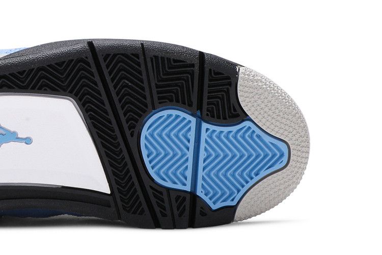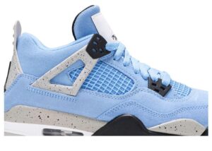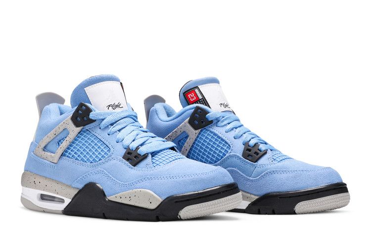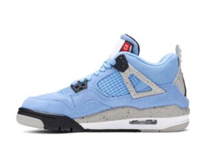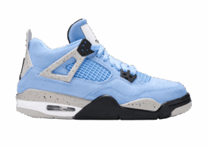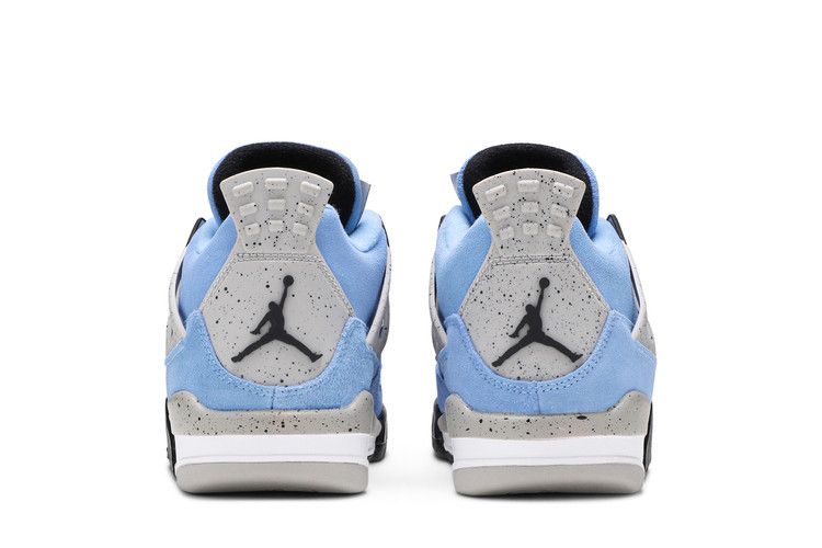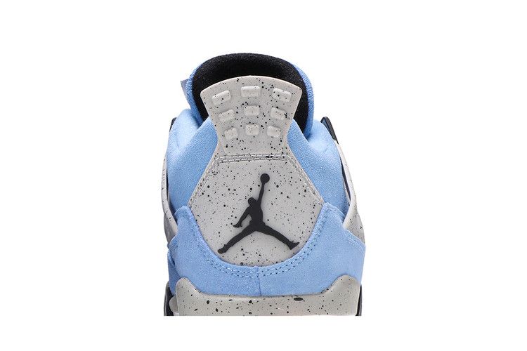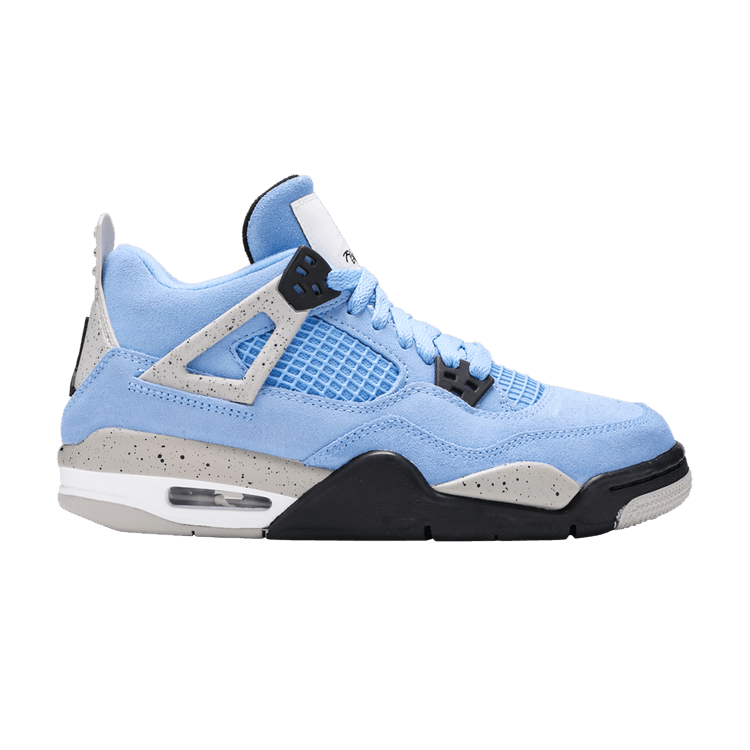 Crafted for big kids, the Air Jordan 4 Retro GS University Blue carries a suede upper in a familiar color that nods to Michael Jordans alma mater, the University of North Carolina at Chapel Hill. The collegiate theme is reinforced with a woven jock tag on the tongue, featuring a design similar to the labeling on throwback Nike basketball jerseys. Speckled grey detailing lands on the sneakers supportive wings, PU midsole and molded heel tab, the latter embellished with Jumpman branding.