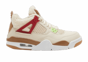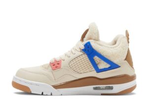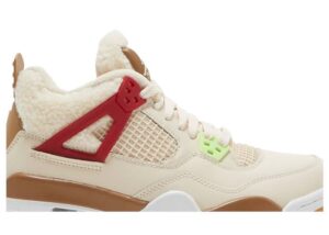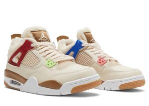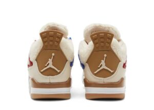 Offered exclusively in kids sizing, the Air Jordan 4 Retro GS Wild Things updates Tinker Hatfields original design with a cozy build. The upper is crafted from tan leather with tonal fleece construction on the collar and tongue. Molded eyelets are rendered in neon green, pink, royal blue and crimson, with the latter two hues color-matched to the sneakers structural wings. Jumpman branding decorates the molded heel tab and woven tongue tag, both rendered in a dark beige finish. Lightweight cushioning is provided by a white foam midsole, enhanced with visible Air-sole cushioning and reinforced with grippy gum rubber under the forefoot and heel.