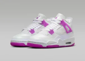Made for little kids, the Air Jordan 4 Retro PS ‘Hyper Violet’ is crafted from white leather with tonal quarter panel netting, the upper is enlivened with bright violet accents. They land on the reinforced eyelets and signature support wings, as well as the Jumpman logo that decorates the woven tongue tag and molded back tab. Anchoring the sneaker is a cushy white foam midsole, supported underfoot by a bright purple rubber outsole.