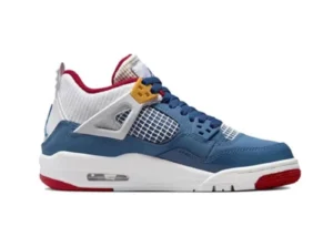 Offered in pre-school sizing, the Air Jordan 4 Retro PS Messy Room showcases a multi-color design inspired by a childs cluttered living space. Crafted from blue nubuck, the upper features white quarter panel netting and a tonal forefoot overlay in glossy patent leather. Red textile lines a padded mid-cut collar in ribbed white textile. Jumpman branding decorates the tongue and back tab. The classic silhouette is mounted on a solid white foam midsole, reinforced by a durable rubber outsole in white and red.