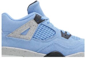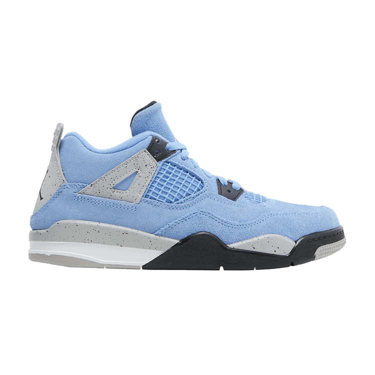Constructed for little kids, the Air Jordan 4 Retro PS University Blue updates the iconic silhouette with a UNC-inspired palette and a smooth suede build. As a callback to the OG White Cement colorway, speckled grey detailing is applied to the TPU wings, Air-infused foam midsole and Jumpman branded heel patch. A second Jumpman can be found on the woven jock tag atop the tongue, modeled after the labeling used on vintage Nike basketball jerseys.