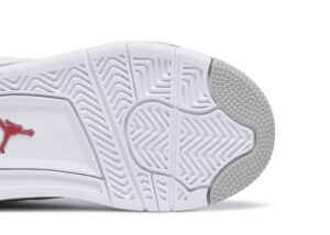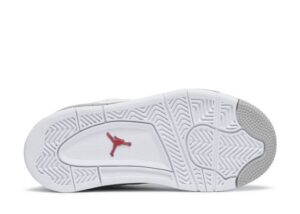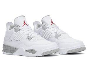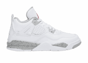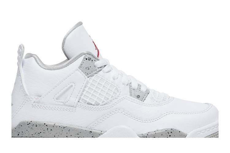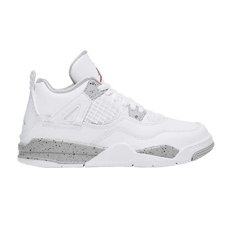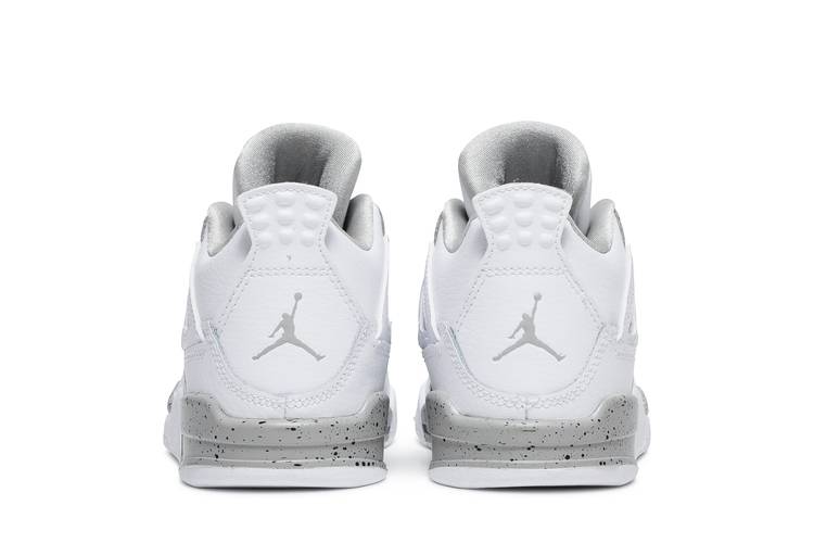 Crafted for little kids, the Air Jordan 4 Retro PS White Oreo presents a neutral colorway of Tinker Hatfields vintage design from 1989. The sneaker carries a white leather upper with subtle hits of Tech Grey on the eyelets, interior lining and speckled foam midsole, absent the visible Air sole unit of the shoes full-sized counterpart. Matching grey Jumpman branding on the heel is contrasted by a scarlet Jumpman icon atop the tongue, delivering the lone pop of color.