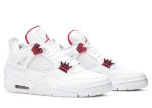 Launching as part of a four-piece Metallic Pack, the Air Jordan 4 Retro Red Metallic treats the classic silhouette to a simple two-tone color scheme. The upper is constructed from white leather, complete with standard details that include quarter-panel netting and a visible Air sole unit at the heel. Contrasting pops of University Red appear on the molded eyelets, interior tongue and Jumpman branding hits at the heel and woven tongue tag.