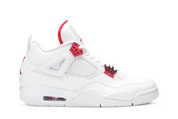 Launching as part of a four-piece Metallic Pack, the Air Jordan 4 Retro Red Metallic treats the classic silhouette to a simple two-tone color scheme. The upper is constructed from white leather, complete with standard details that include quarter-panel netting and a visible Air sole unit at the heel. Contrasting pops of University Red appear on the molded eyelets, interior tongue and Jumpman branding hits at the heel and woven tongue tag.